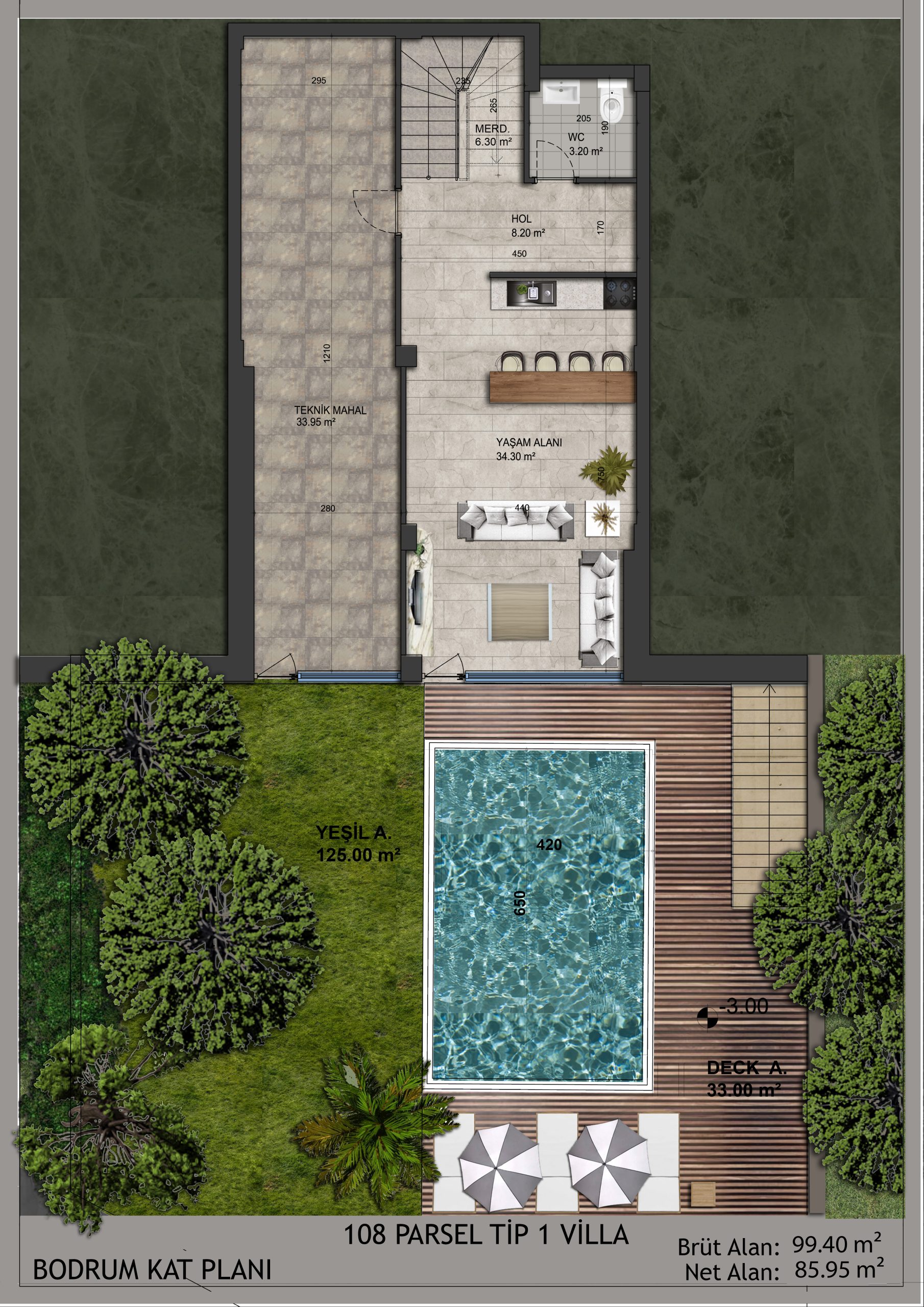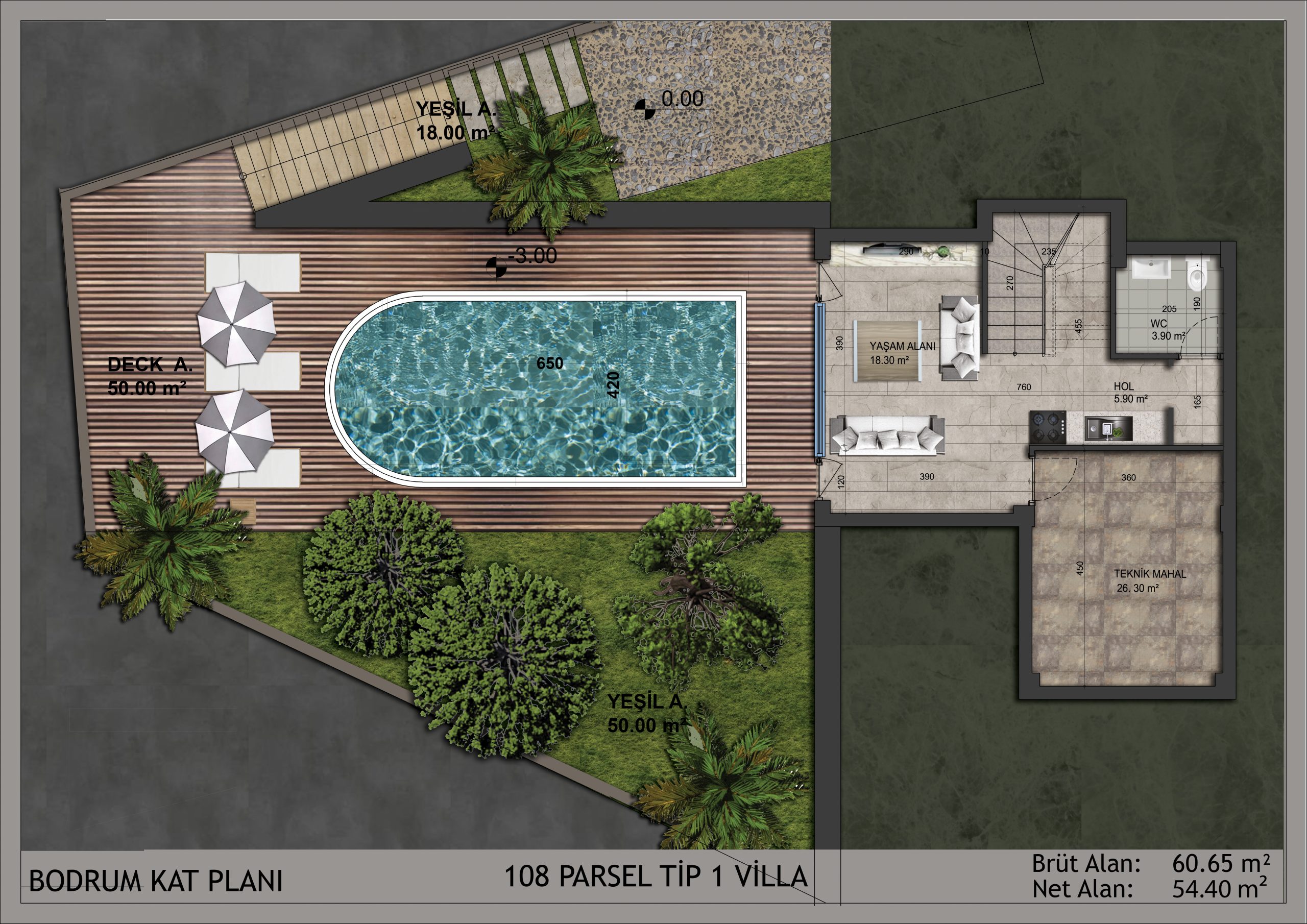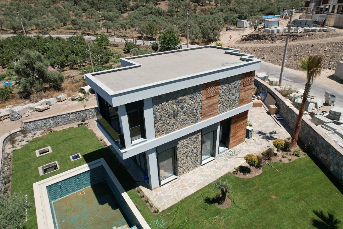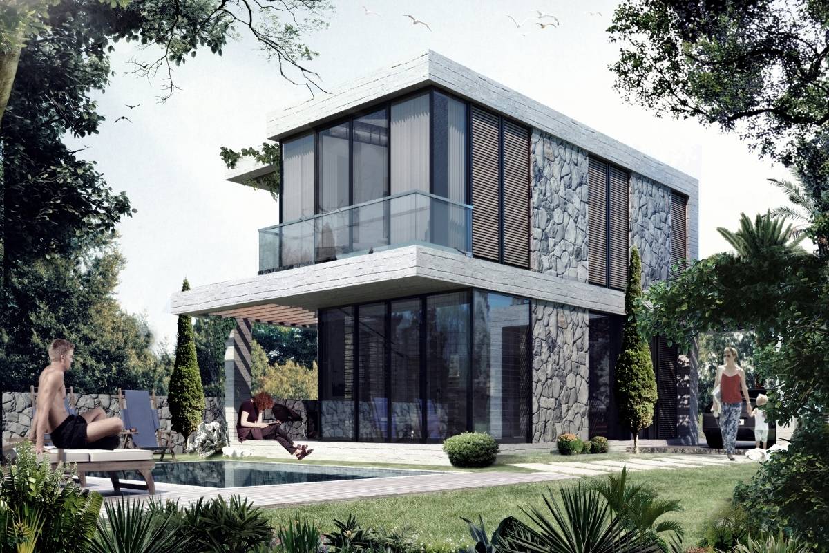 Bahçenizde doğal yaşamına devam eden portakal ve zeytin ağaçları yer alıyor. Dışarıdaki yaşam ve içerideki yaşam alanları arasında bir bütünlük kuruldu. Doğal taşlar ve ahşap ağırlıklı malzemeler kullanarak doğal ortam ile bütünleştik.