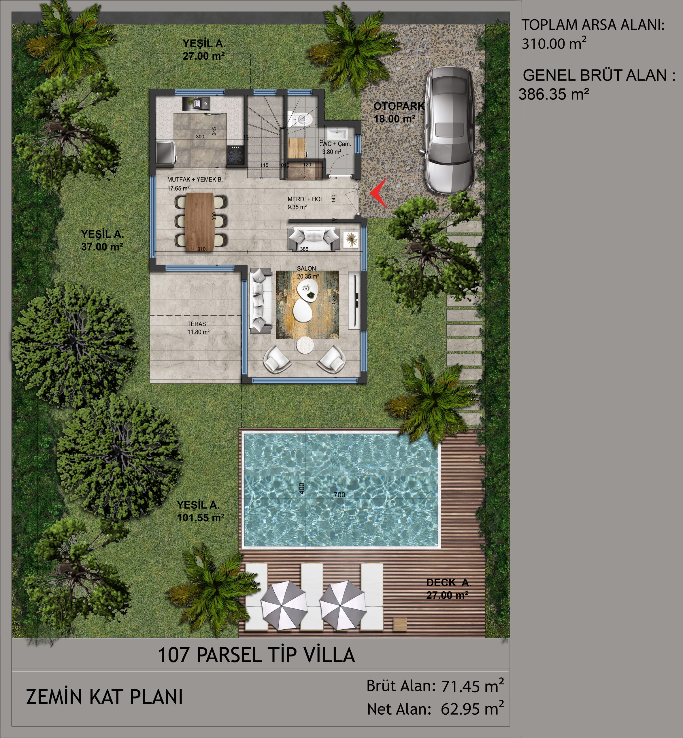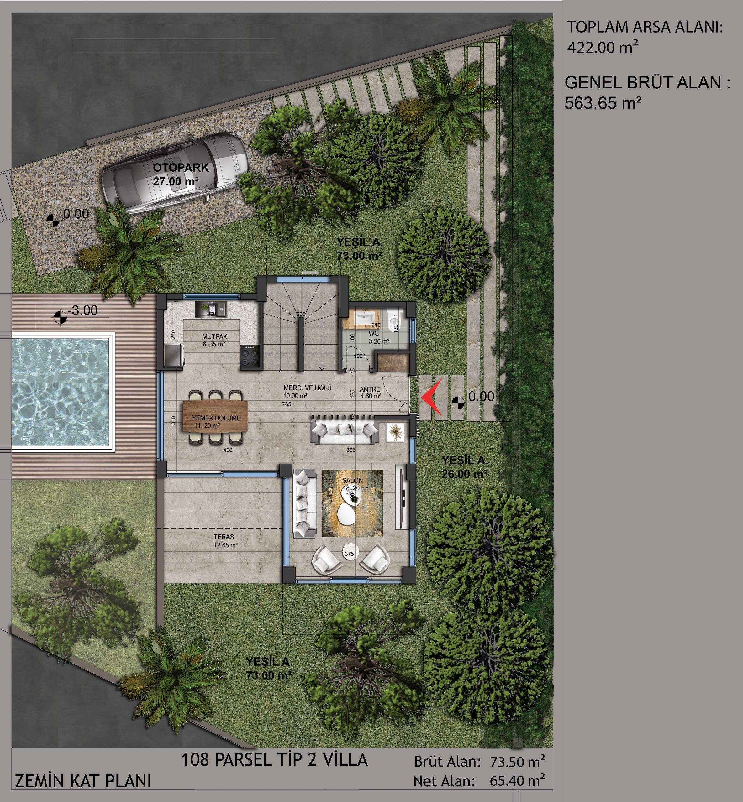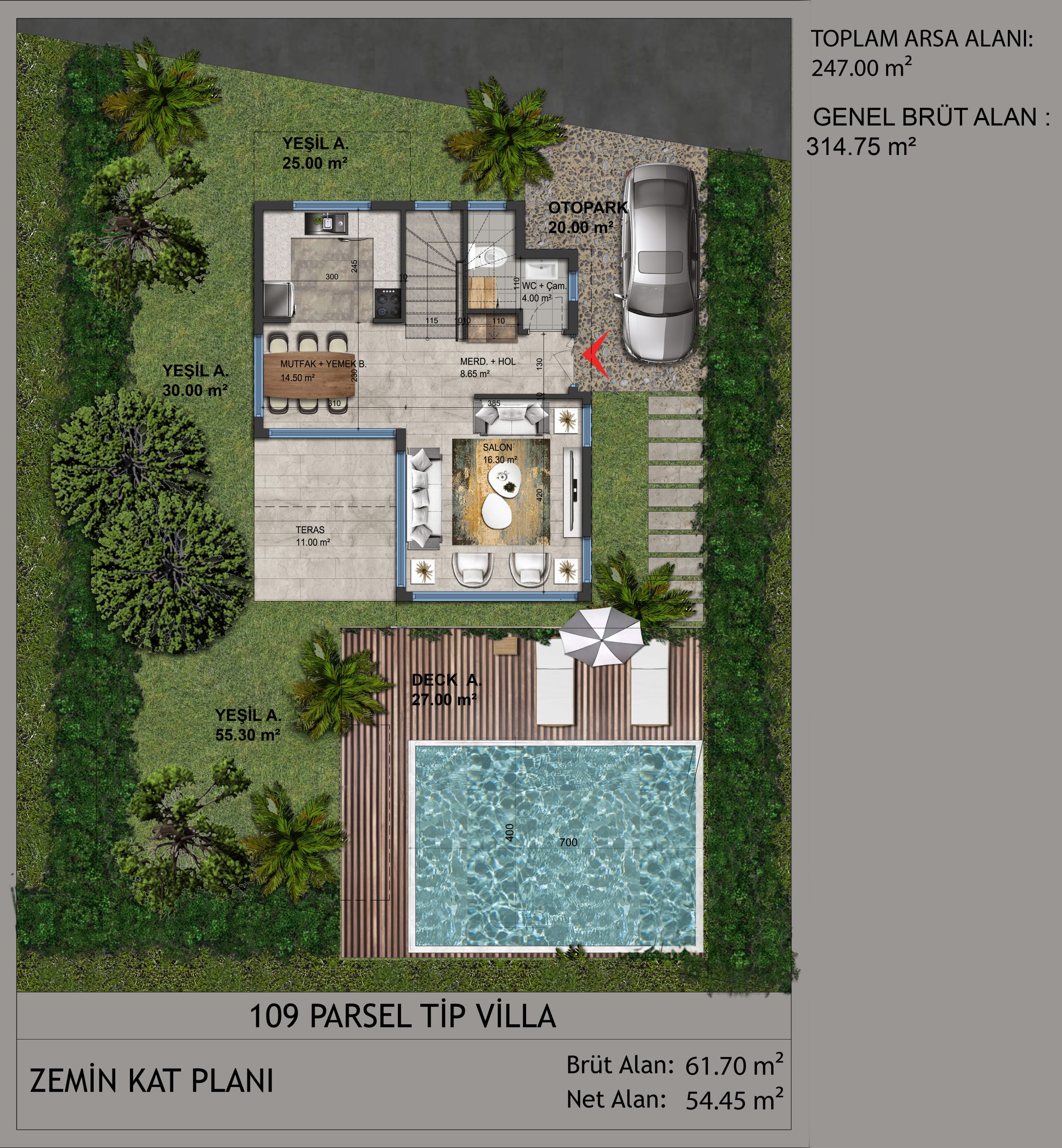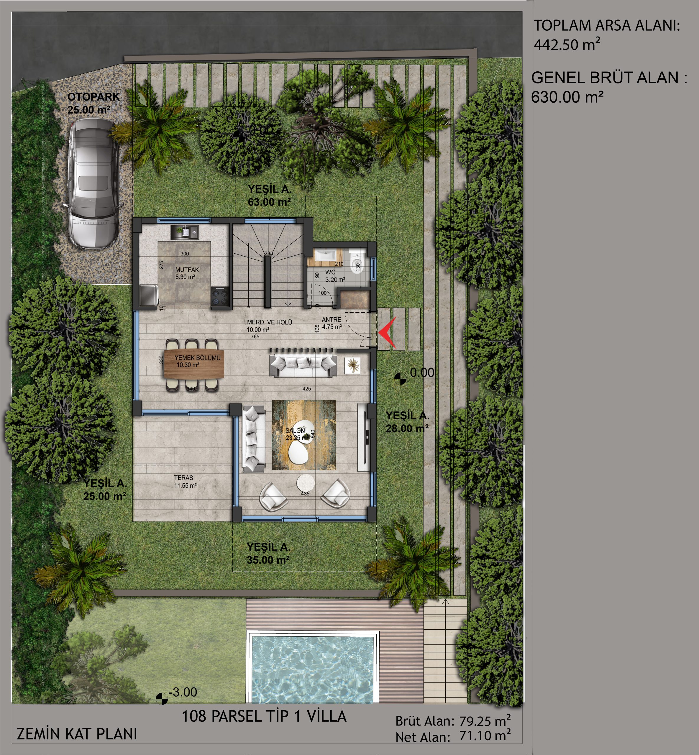 Bahçenizde doğal yaşamına devam eden portakal ve zeytin ağaçları yer alıyor. Dışarıdaki yaşam ve içerideki yaşam alanları arasında bir bütünlük kuruldu. Doğal taşlar ve ahşap ağırlıklı malzemeler kullanarak doğal ortam ile bütünleştik.